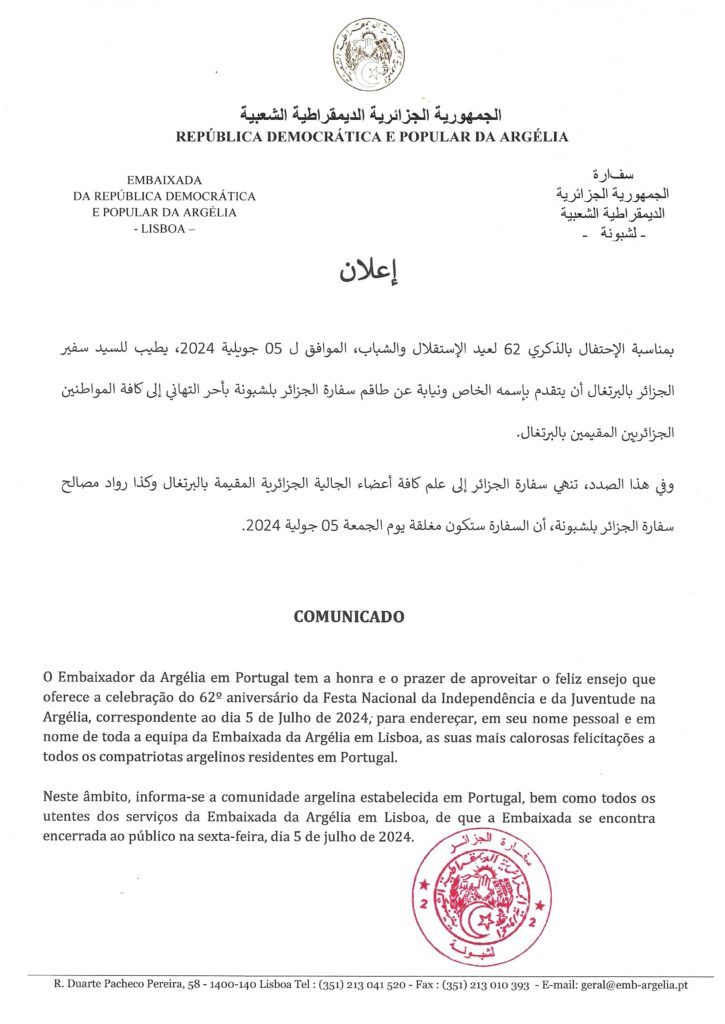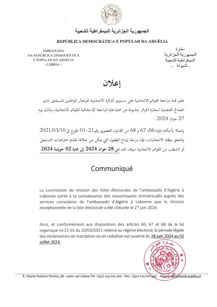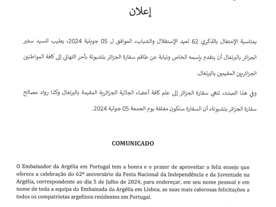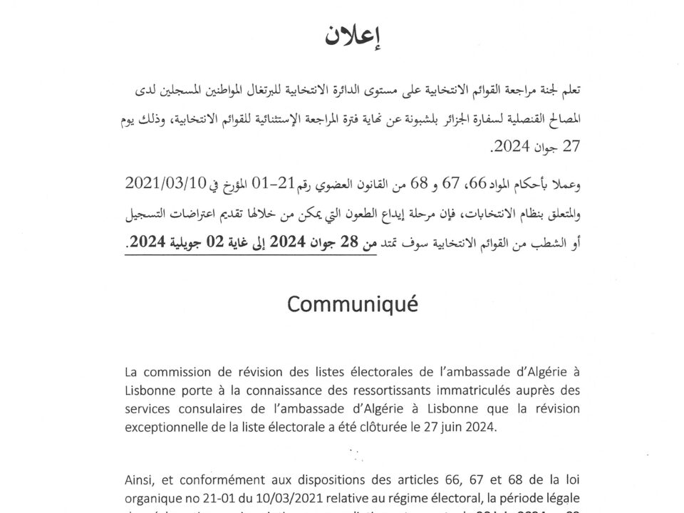 بلاغ تعلم سفارة الجزائر في لشبونة جميع أفراد الجالية الجزائرية المقيمة بالبرتغال بأن الأكاديمية الجزائرية للعلوم والتكنولوجيا (A.A.S.T) قد فتحت باب العضوية للإنخراط […]